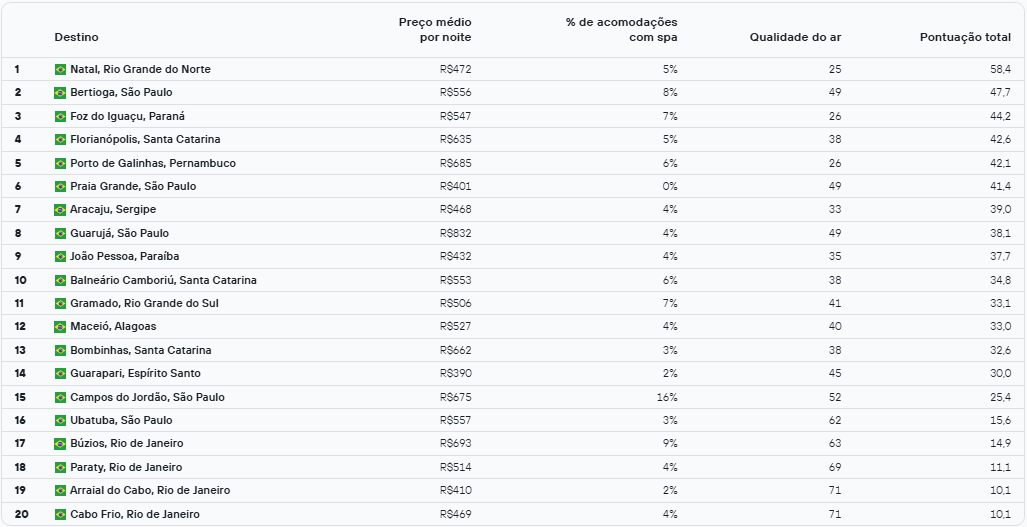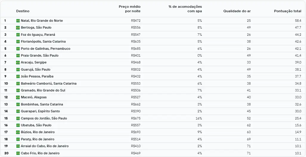 Com cenários deslumbrantes que mesclam praias paradisíacas e dunas que recebem o pôr-do-sol, Natal lidera o ranking como opção de destino para uma escapada pacífica. Já Bertioga, no litoral norte de São Paulo, é o segundo colocado e uma opção rápida de refúgio para quem mora na região Sudeste do país, graças ao seu ambiente sereno cercado por belas praias e vegetação exuberante, fatores que elevam a qualidade do ar. Completando o top 3, Foz do Iguaçu proporciona uma atmosfera calmante para aqueles que são privilegiados com o som das quedas d’água das Cataratas.
