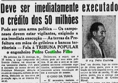 Em outubro de 1955, às vésperas das eleições presidenciais daquele ano, o jornal comunista Imprensa Popular, demonstrando ter certeza de que Pedro Coutinho tivesse sua atuação reconhecida pela grande maioria dos lavradores do Sertão Carioca, chamou-o de “líder camponês”. Foi nesta condição que ele conclamou “seus companheiros de profissão [os “camponeses” cariocas] a votar em J-J” (chapa presidencial composta por Juscelino Kubitschek e João Goulart). Só “com êles”, continuava Coutinho, “teremos o clima desejável para que consigamos vencer os grileiros, a distribuição de terras aos lavradores, títulos definitivos das terras já cultivadas pelos posseiros, revisão dos contratos e fixação à terra, concessão de crédito fácil”, etc.