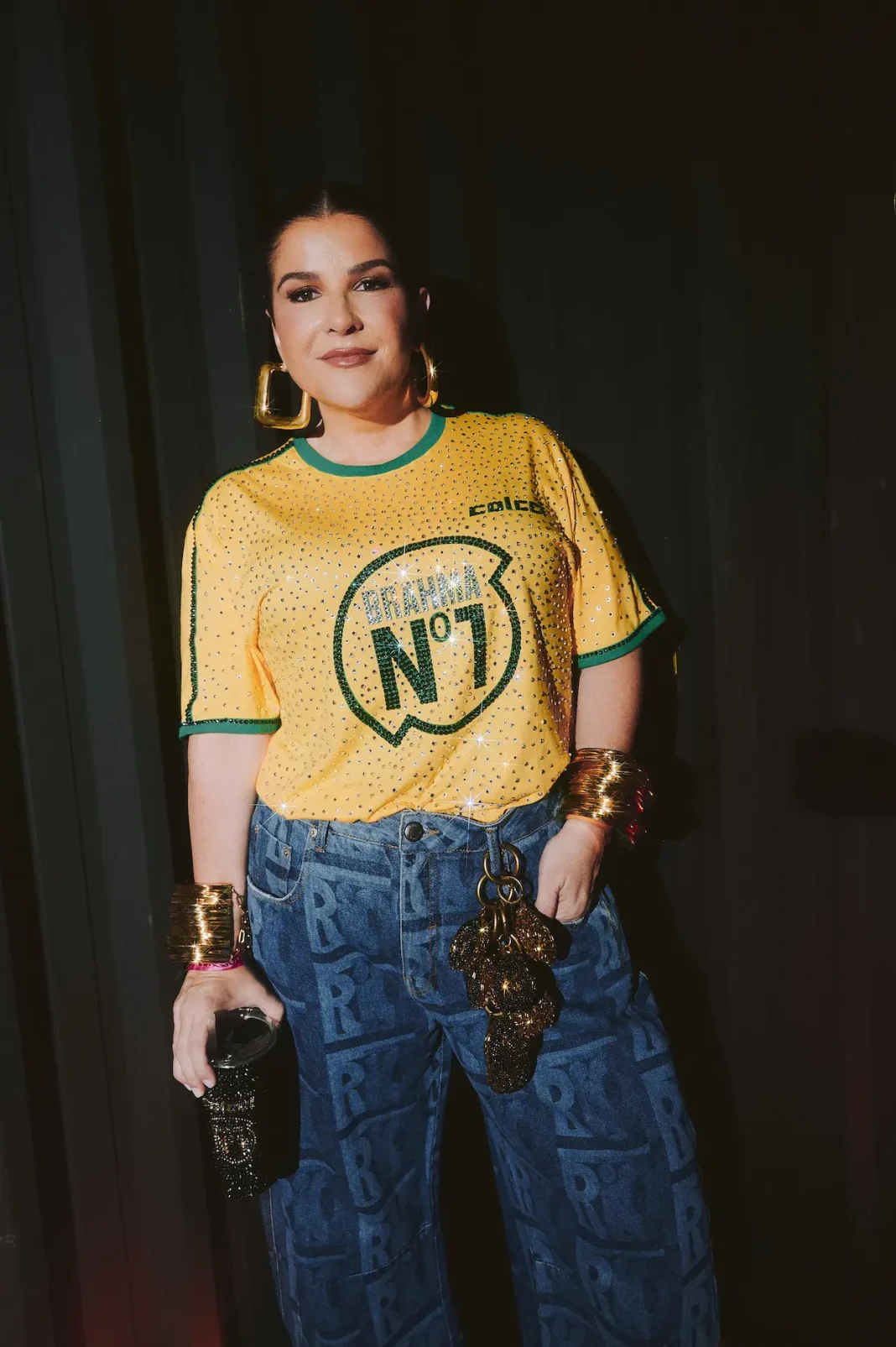 A escolha de Ju Ferraz não é fortuita. Em um momento onde a individualização extrema busca apagar os símbolos de união da festa, ela surge com a camisa verde e amarela do Camarote Nº1 personalizada com aplicações de brilho, harmonizada com uma calça jeans que ostenta a inscrição “Brasil”. Esse “look manifesto” é um ataque direto à elitização estética da folia. Ju resgata o abadá como um território comum, uma bandeira de identidade coletiva que nivela o espaço e recorda que, no Setor 2, a verdadeira estrela é a cultura nacional e não o ego individual.