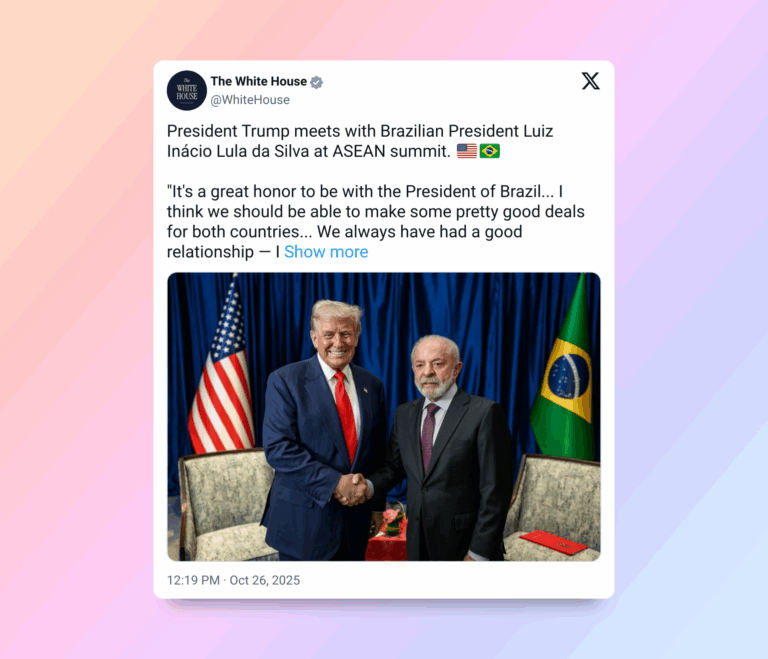 A Casa Branca publicou neste domingo (26) uma foto do encontro entre o presidente dos Estados Unidos, Donald Trump, e o presidente do Brasil, Luiz Inácio Lula da Silva, realizado à margem da cúpula da ASEAN, em Kuala Lumpur, na Malásia. Segundo a postagem no X, Trump destacou o tom amistoso e afirmou que “conseguiremos fechar bons negócios para ambos os países”, reforçando a continuidade de um relacionamento positivo entre as duas nações.