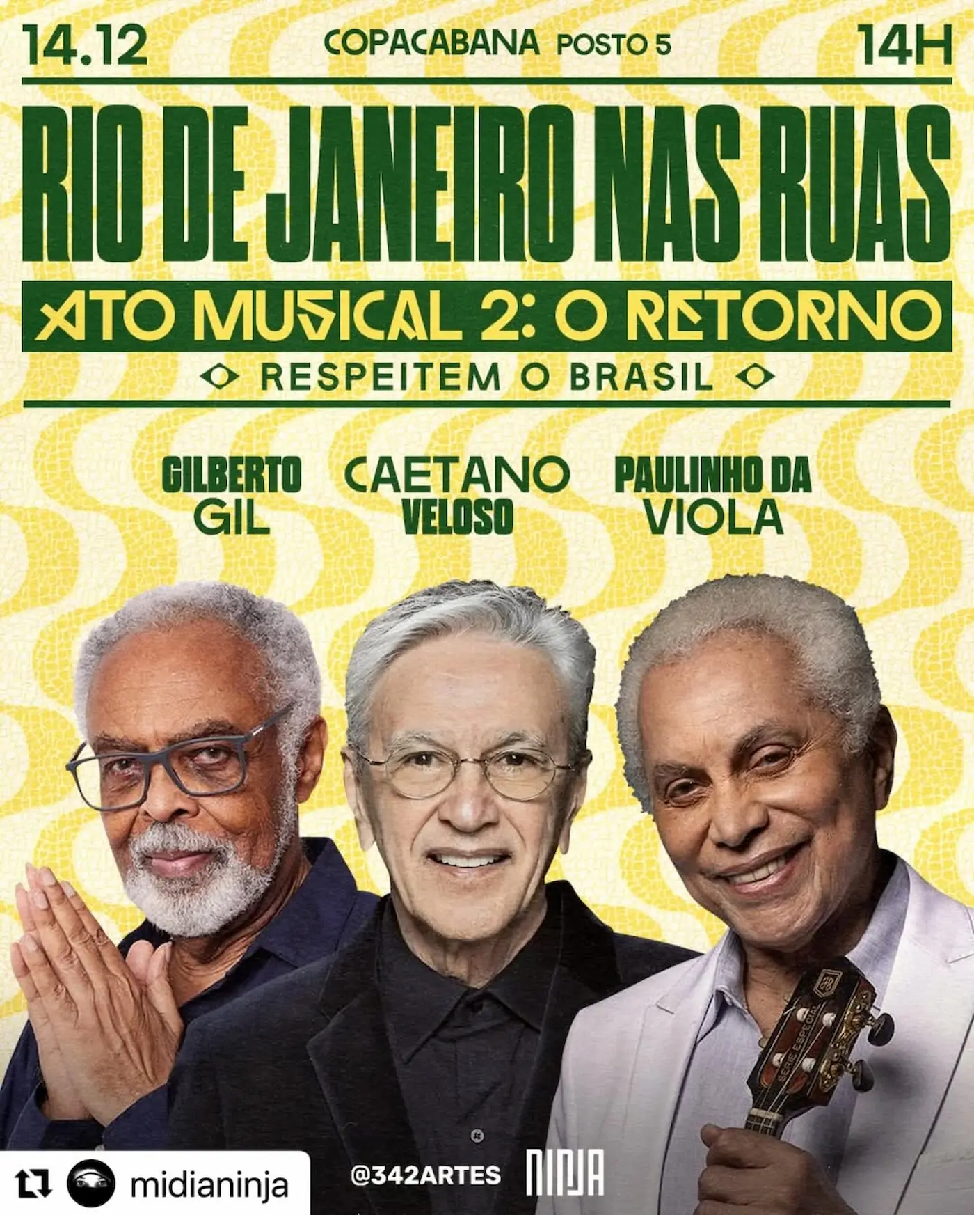Gilberto Gil e Paulinho da Viola confirmaram sua participação no “Ato Musical II: O Retorno”, convocado por Caetano Veloso para este domingo (14). O evento ocorrerá novamente na orla de Copacabana, no Rio de Janeiro.