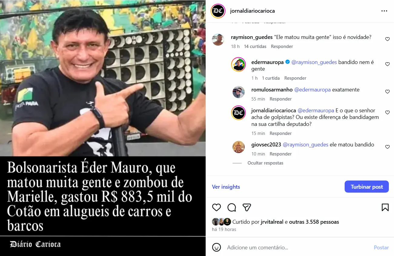 Em uma publicação recente no Instagram do Jornal Diário Carioca sobre os altos gastos de R$ 883,5 mil do deputado federal Éder Mauro (PL-PA) com aluguel de carros, barcos e aeronaves usando a chamada cota parlamentar (Cotão), o parlamentar bolsonarista inflamou ainda mais sua já chamuscada imagem pública ao proferir a controversa frase “bandido nem é gente”, como se houvesse pena de morte no Brasil, rejeitando qualquer humanização de pessoas acusadas de crimes, ou como se a lei lhe concedesse o direito de matar.