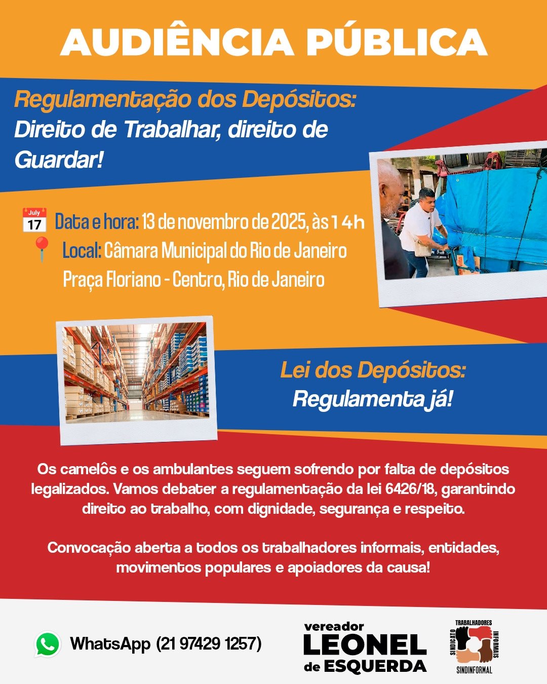 Para debater alternativas a essa realidade, a Câmara de Vereadores realizará, na quinta-feira às 14h, uma audiência pública promovida pela Comissão do Trabalho Informal, presidida pelo vereador Leonel de Esquerda (PT). Com o tema “Direito de trabalhar, direito de guardar!”, o encontro reunirá camelôs e autoridades para tratar sobre a necessidade da implementação de depósitos públicos, além da importância de viabilizar parcerias para o armazenamento de instrumentos de trabalho.