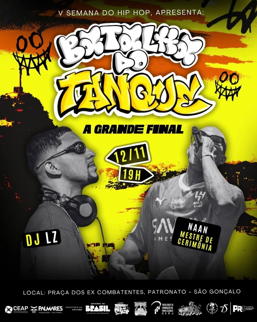 O encerramento será na tradicional Batalha do Tanque, em Alcântara, São Gonçalo, referência estadual no freestyle, reunindo MCs, DJs, breakers e o animado público de toda a Região Metropolitana.